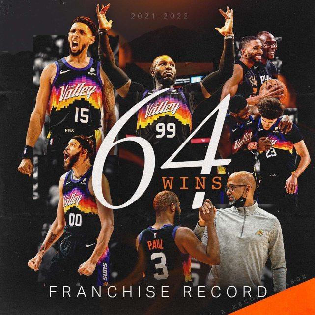 第一,太阳打出了64胜18负的战绩,创造了队史新纪录!他们比之前的队史纪录多赢了两场比赛,也比上赛季多赢了13场球!