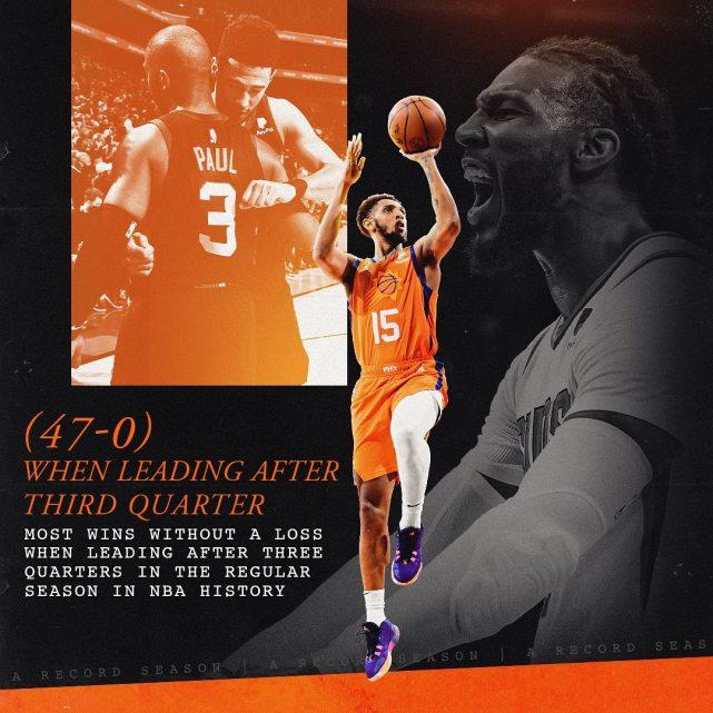 第四,当太阳在前三节结束比分领先时,他们打出了47胜0负的表现,从未在末节被翻盘!