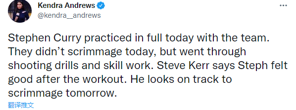 今天谈到库里的训练状态,科尔表示:他今天参与了大部分的训练,并且训练后感觉很好,看起来他明天会继续参加训练;小佩顿则表示库里看起来还是那个他,这是个好兆头,全队都渴望季后赛。