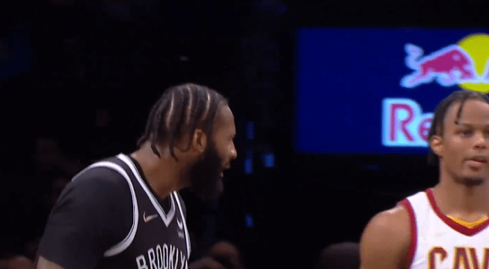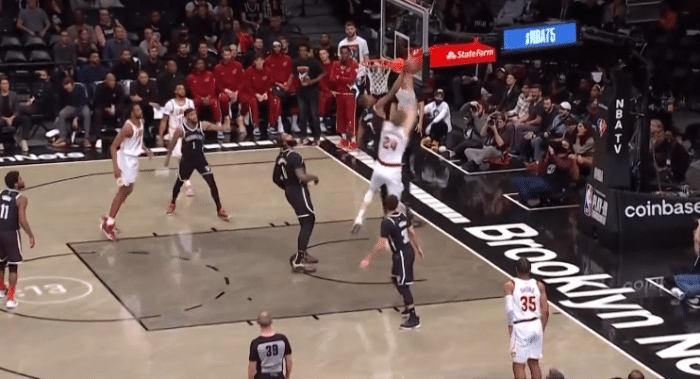 这是首节中段,骑士的马尔卡宁溜底线发动进攻,他转身暴起,结果直接被杜兰特来了一个钉板血帽,直接帽翻在地。紧接着篮网推动反击,杜兰特一个击地内传内,庄神德拉蒙德暴扣,可惜的是庄神的加罚没有命中。
