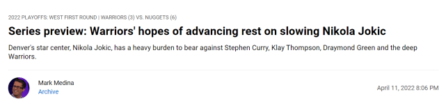 官网认为虽然掘金在常规赛对阵勇士3胜1负,但季后赛是另外一段故事。约基奇可以击败任何人,可勇士整体天赋和深度更胜一筹,