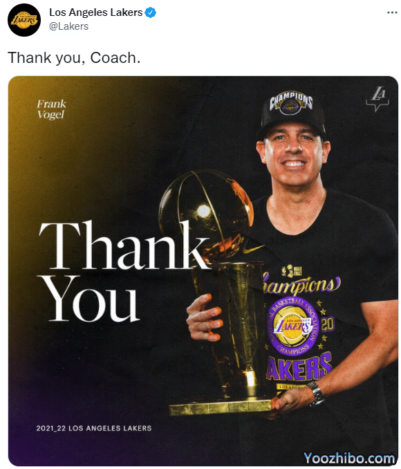 来源:24直播网04-12 11:0424直播网04月12日讯 ,2021-22赛季常规赛结束的第一天,洛杉矶湖人正式宣布解雇主教练沃格尔,官推晒沃格尔捧杯照,并且配文写道:谢谢你,教练。