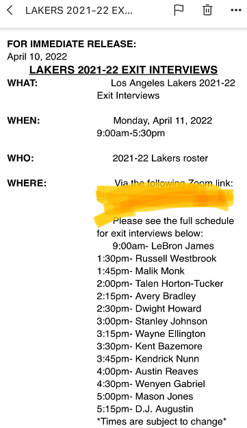 湖人官方发来的赛季总结采访安排,北京时间今晚12点开始,詹姆斯打头,根据名单显示,没有浓眉哥,也没有沃格尔。