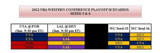 相比东部的复杂,西部的不确定因素就少多了。明天爵士和开拓者一战,湖人和掘金一战,将决定西部第5和第6的归属,比赛结果只有4种组合可能——