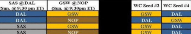 独行侠胜+勇士胜:勇士第3,独行侠第4