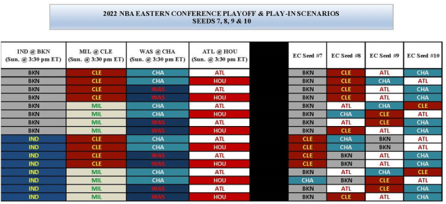 目前,篮网(BKN)、骑士(CLE)、黄蜂(CHA)和老鹰(ATL)已经确定要参加东部附加赛,但具体的排名和对阵要看明天的比赛结果,16种可能如下图展示——