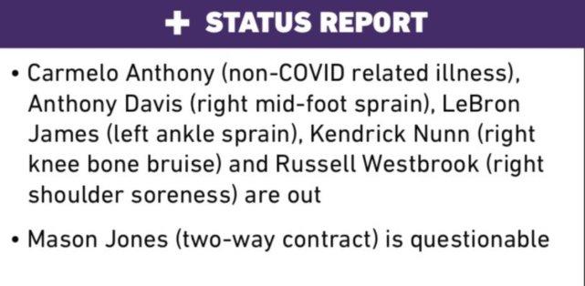 湖人官方宣布,勒布朗-詹姆斯因左脚踝伤势将不再出战本赛季最后两场比赛。今日对雷霆一战,湖人的詹姆斯、戴维斯、威少和安东尼都将继续缺席。詹姆斯不再出战,也意味着他实际上退出了得分王的竞争,这一荣誉将在恩比德和字母哥之间产生。