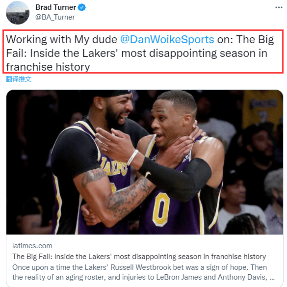 湖人内部不和曝光,《洛杉矶时报》湖人随队记者BradTurner撰文写道:最大的失败,湖人队史最令人失望的赛季;该记者爆料球队在训练营就出现了问题,透露威少不尊重沃格尔,在训练营中不服从教练的安排