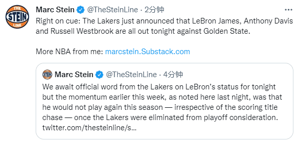 来源:24直播网04-08 15:5424直播网04月08日讯 ,洛杉矶湖人队官方正式宣布,詹姆斯(左脚踝扭伤)、浓眉(中足扭伤)和威少(右肩酸痛)三巨头都因伤缺战勇士;随后名记MarcStein确认,随着湖人正式无缘附加赛,詹姆斯本赛季不会再次上场,提前放弃争夺得分王。