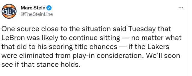 输给太阳,让湖人的2021-22赛季实际上已经结束了。如今,湖人最大的悬念在于詹姆斯能否拿下得分王,成为史上最老的得分王。詹姆斯必须至少再打两场,才能按最终的场均得分参加得分王竞争,最新的数据显示,恩比德场均30.42分,领先詹姆斯0.15分。