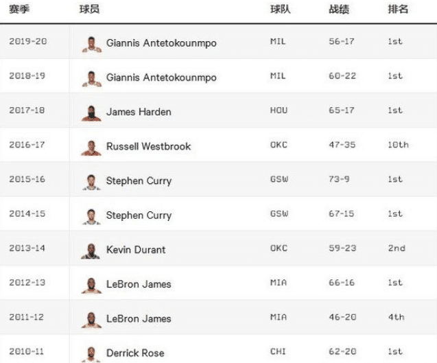 比如2018-2020年两夺MVP的字母哥,他的雄鹿都是联盟第一。往上翻,哈登的火箭也是当赛季联盟第一。库里两次也都是联盟第一,13-14赛季的杜兰特是联盟第二名。11-13年,詹姆斯两夺MVP,一次是联盟第四,一次是联盟第一。10-11年的杜兰特也是联盟第一。再往上,之前的纳什、邓肯、艾弗森等,所在球队都是当赛季联盟前四名。