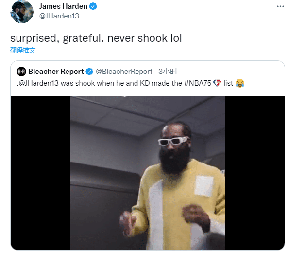 哈登本人转发这一幕,发推写道:惊讶,感激,从未吃惊(哈哈哈);哈登还发推写道:EVER? WOW(真入选了吗?哇哦);哈登还在Ins动态中晒出自己入选75大球星的喜讯,又勉励自己继续加油。