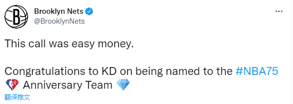 哈登正式入选后,篮网官方也是第一时间恭喜哈登成为历史最伟大球员的一员;篮网现有阵容中已经有两位入选历史75大球星榜单。