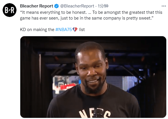 正式入选NBA75大球星榜单后,杜兰特接受记者的采访,直言:说实话这意味着一切,成为史上最伟大球员之一的感觉太甜蜜了。