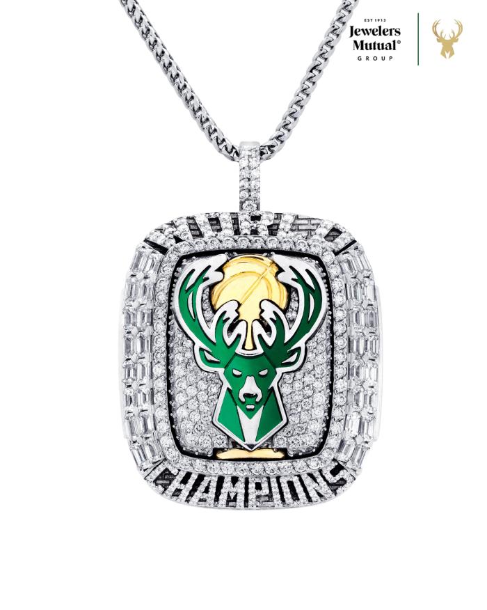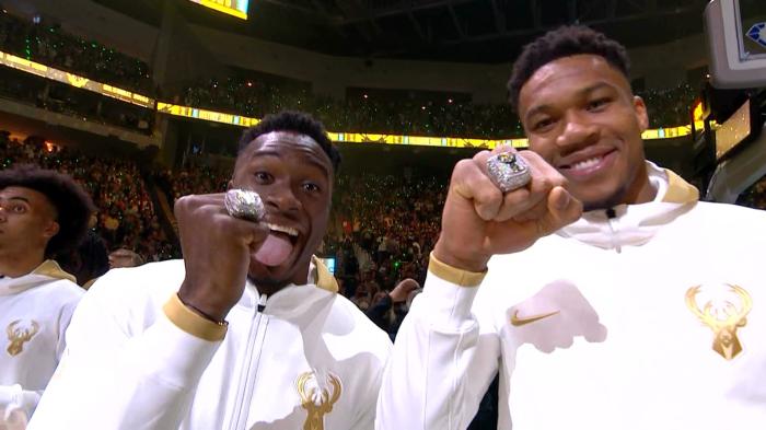 字母哥和字母哥哥都戴上总冠军戒指,在雄鹿总冠军戒指上,刻着球员的名字、球衣号码以及季后赛各轮系列赛的总比分,上面镶着50颗钻石,这款总冠军戒指还可以一分为二变成一个项链;雄鹿正式颁发总决赛戒指,这意味着上赛季正式结束,新赛季正式开始。