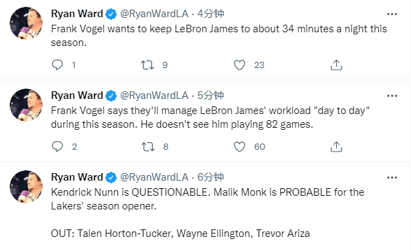 湖人主帅沃格尔表示,詹姆斯新赛季每场大概出战34分钟,不仅对詹姆斯设置限时令,而且表示詹姆斯不会打满82场常规赛;沃帅还表示球队首发阵容已经确定,但他拒绝透露。