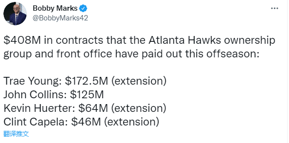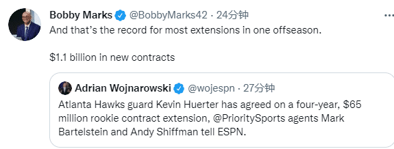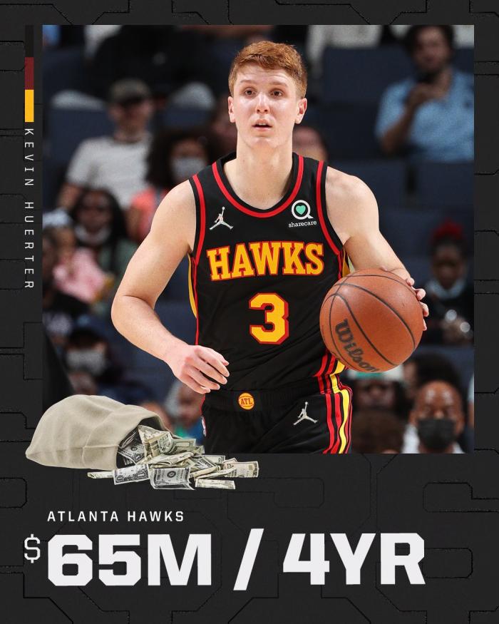 许尔特(18年第19顺位)和老鹰达成协议,双方将签下一份4年6500万美元的提前续约合同;上赛季许尔特为老鹰出战69场比赛,场均得到11.9分3.3篮板3.5助攻;今年休赛期,老鹰狂砸4.08亿美元从而保住核心阵容,除了续约许尔特,还有5年1.725亿续约特雷-杨、5年1.25亿续约科林斯、2年4600万续约卡佩拉。