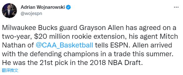 雄鹿已与格雷森-阿伦(18年第21顺位)达成2年2000万美元提前续约,今夏阿伦被灰熊交易到雄鹿,上赛季出战50场比赛,格雷森-阿伦场均得到10.6分3.2篮板2.2助攻。