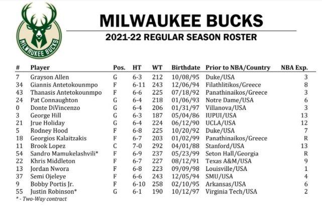 雄鹿的16人名单包括:7号格雷森-阿伦、34号扬尼斯-阿德托昆博、43号萨纳西斯-阿德托昆博、24号帕特-康诺顿、0号丹特-迪文琴佐、3号乔治-希尔、21号朱-霍乐迪、5号罗德尼-胡德、18号乔治斯-卡莱察基斯、11号布鲁克-洛佩斯、22号克里斯-米德尔顿、13号乔丹-恩沃拉、37号萨米-奥杰莱、9号鲍比-波蒂斯、54号桑德罗-马穆克拉什维利(双向)和55号贾斯汀-罗宾逊(双向)。