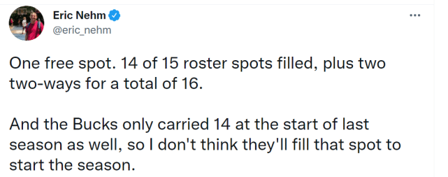 来源:24直播网10-18 11:5524直播网10月18日讯 ,据密尔沃基记者Eric Nehm报道,雄鹿已经敲定了新赛季的16人名单,其中包括常规阵容的14位球员和双向合同的2位球员。和上赛季一样,雄鹿在常规阵容中留了一个空缺名额,他们有可能在赛季期间再视具体需求签人。
