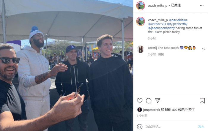 湖人助教迈克-潘佩西更新Instagram,晒出他和湖人球星安东尼-戴维斯参加今日球队野餐活动的合照,配文写道:今天在湖人野餐活动中享受一些乐趣;浓眉身穿灰色运动服,搭配应有湖人logo的针织帽,冲着镜头咧嘴大笑。
