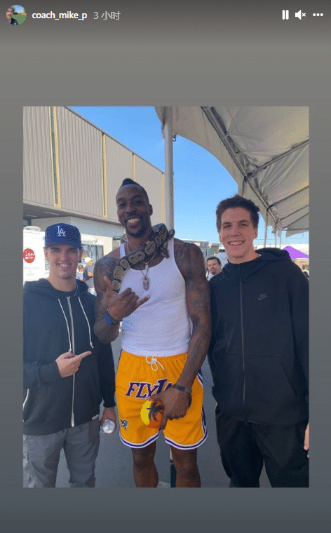 洛杉矶当地天气晴朗,湖人队举办野餐活动,霍华德身穿白色小背心和紫金配色短裤,上面印着“FLY LA”(起飞吧,湖人)字样;霍华德带着自己心爱的蟒蛇参加活动,和球迷合影时,这蟒蛇就在霍师傅的肩膀上,两位球迷貌似都不害怕,合影时露出笑容。