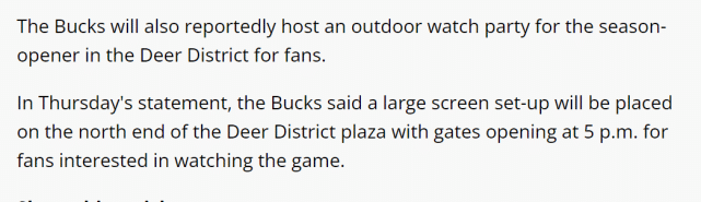密尔沃基当地媒体报道,比赛计划在当地时间晚上6点30分进行,而领取戒指的仪式预计在晚上5点45分开始,球迷们允许进场的最早时间是5点。雄鹿也会在球馆外准备足够大的场地召开观赛派对,让更多球迷通过大屏幕来见证队史上的这一重要时刻。
