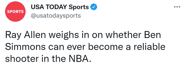 阿伦仍相信西蒙斯能练出投篮,其实,三年前他就曾表达过类似的观点,不过当时,他就看走眼了。2018年的一档播客节目上,主持人问阿伦:“如果一定要在本-西蒙斯和朗佐-波尔之间选一个学生,作为投篮教练的你,会选择谁?”阿伦没有丝毫犹豫,脱口而出:“我会选择本。”随后,阿伦表示,他没有信心能够修正波尔的投篮姿势,但他有信心让西蒙斯的投篮更稳定。