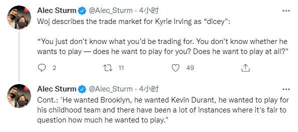 该记者还谈到了欧文当前的处境,他表示,欧文目前在交易市场上的评估是冒险的:你不知道你交易来他会是啥样的,你不知道他是否想上场,他是否想为你们球队打球?或者他就根本不想打比赛?