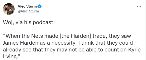 名记沃纳罗斯基表示:当篮网队完成哈登交易之后,他们将詹姆斯-哈登视为必需品(必须留下的球员)。我觉得他们现在可能已经明白,他们可能无法指望凯里-欧文;我觉得从哈登来到布鲁克林的那天起,欧文就已经是‘可牺牲、可抛弃’的。