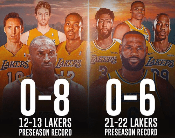 季前赛6战全负,让大家不禁想起9年前的湖人四巨头。当时拥有纳什、加索尔、科比和霍华德的湖人队在季前赛也遭遇全败(0胜8负)。以詹姆斯为首的湖人球员和教练并没有因此影响心情。他们将继续训练,认真备战,等待4天后的常规赛揭幕战,对手是曾在季前赛两次击败他们的勇士队。