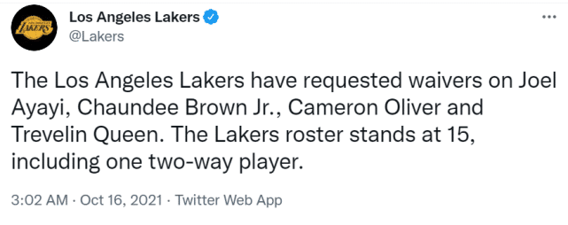 被裁掉的四名球员,除了阿亚伊是双向合同,其他三位都是训练营合同。阿亚伊为湖人出战5场季前赛,场均得到0.4分1.4篮板0.6助攻;昌迪-布朗为湖人出战5场季前赛,场均得到7.6分1.4篮板0.2助攻;奎恩为湖人出战4场季前赛,场均得到3.7分2篮板0.7助攻;奥利弗为湖人出战5场季前赛,场均得到2.4分0.8篮板1.2助攻。