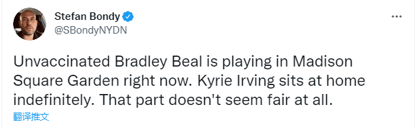 比尔现身纽约麦迪逊花园球馆打比赛被质疑,美记者stefan bondy发推写道:未接种疫苗的布拉德利·比尔正在麦迪逊广场花园打比赛,而欧文被无限期禁赛只能坐在家里,这一点也不公平。