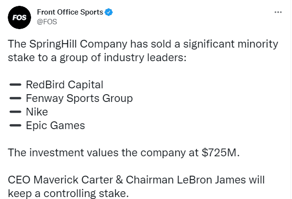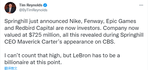 据名记Tim Reynolds报道,SpringHill公司已经宣布完成融资,公司CEO卡特透露该家公司目前的估值是7.25亿美元,发推直言:勒布朗已经成为亿万富翁。