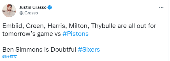来源:24直播网10-15 17:0324直播网10月15日讯 ,费城76人官方公布季前赛对阵活塞的伤病报告,恩比德、丹尼-格林、哈里斯、米尔顿和赛布尔都将休战不打,西蒙斯的出战状态被列为出战成疑(doubtful,25%出场可能性)。