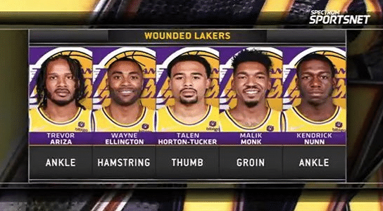 湖人硬仗国王,也并非是全员出战,根据赛前消息项目,已经有四名球员确定因伤无缘与国王的比赛,分别是左腿筋酸痛的艾灵顿、进行右脚踝手术的阿里扎、右手拇指扭伤的霍顿-塔克、右侧腹股沟拉伤的蒙克、和右脚踝扭伤的纳恩。