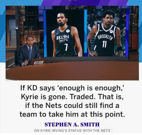除了喷欧文的行为是愚蠢的,A-史密斯还谈到了篮网当前的困境,尽管篮网队内还有杜兰特和哈登两位超级球星,但是在A-史密斯看来欧文如果能留在篮网专注于篮球,那么拥有三巨头的篮网将会拥有很大的夺冠希望,现在欧文做出的愚蠢行为,导致了篮网夺冠希望变小,因为篮网现在变成了2人组,不再是3巨头,至少在篮网能成功交易欧文之前,篮网的夺冠希望远远没有一开始那么大。