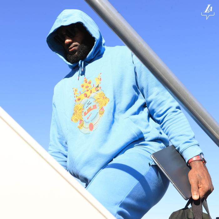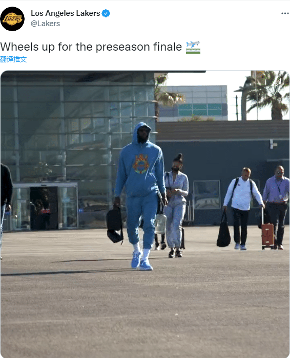 36岁詹姆斯身穿一套纯色运动套装,卫衣上印着詹姆斯的logo以及王冠标志,戴着帽子和墨镜,表情十分严肃;一只手提着大水壶,另一手提着包并拿着平板;上一场湖人又输给勇士遭遇五连败,詹姆斯上场26分钟,16投7中拿到17分6篮板4助攻3抢断,却有6次失误。