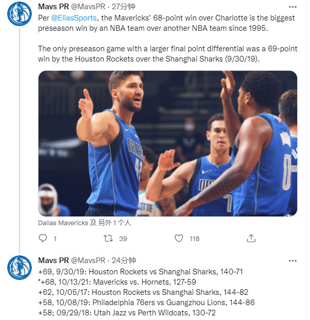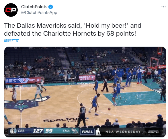 美媒ClutchPoints也晒出最终比分,发推写道:达拉斯独行侠说:拿着我的啤酒!之后68分大胜夏洛特黄蜂。