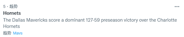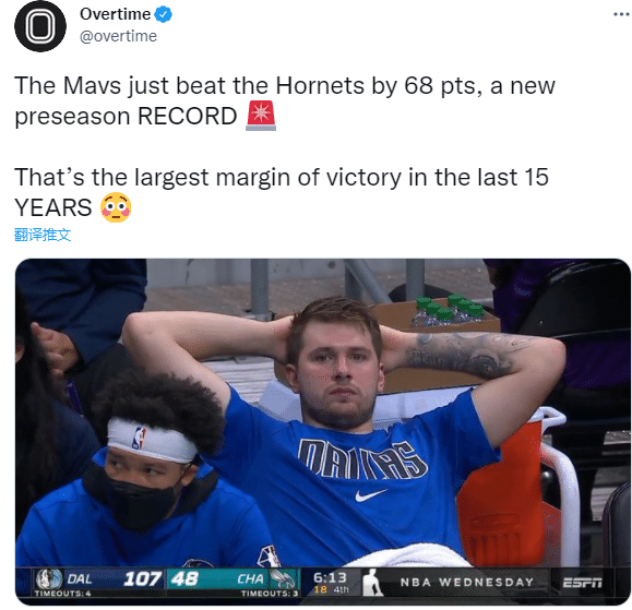 黄蜂惨败68分冲上推特热搜榜第五名,美媒Overtime晒出东契奇末节双手抱头,斜躺替补席观战的惬意一幕,配文:独行侠刚刚68分大胜黄蜂,一个新的季前赛纪录,NBA近15年最大分差的胜利。