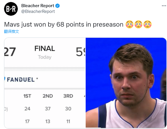 美媒《露天看台》晒出独行侠和黄蜂此战的最终比分,并且配上东契奇的瞪眼表情包,配文:独行侠在季前赛赢了68分;美媒NBA Memes晒出乔丹哭脸表情包,配文:黄蜂总经理现在的心情;黄蜂季前赛已经收官,4战3负1胜,包括30分惨败灰熊和68分惨败独行侠。