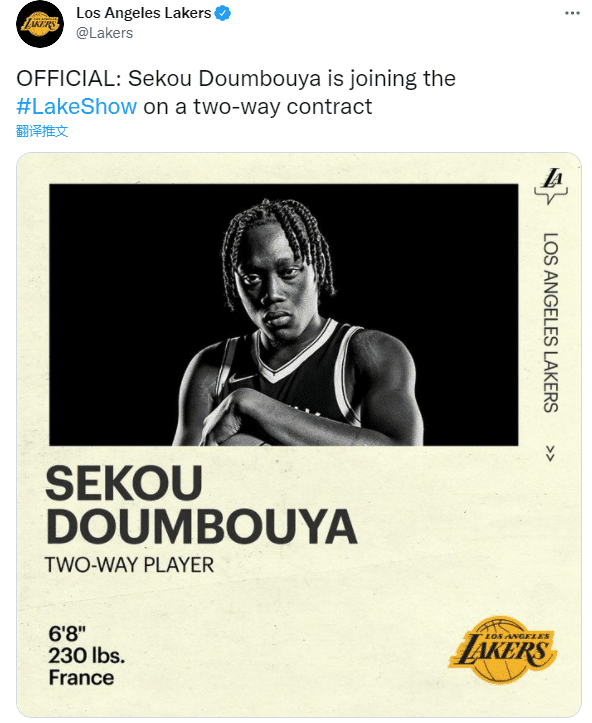湖人官宣签约,用双向合同签下敦布亚,此前敦布亚在篮网和活塞交易中被交易到布鲁克林,之后篮网把敦布亚交易到火箭,紧接着火箭裁掉敦布亚,现在湖人签下他;上赛季,20岁的敦布亚为活塞出战56场比赛,场均上场15.5分钟能够拿到5.1分2.6篮板0.8助攻。