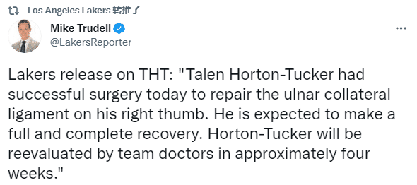 来源:24直播网10-13 11:4524直播网10月13日讯 ,洛杉矶湖人正式宣布,塔伦-霍顿-塔克已经成功接受修复右手拇指的尺侧副韧带的手术,预计他会完全康复,霍顿-塔克将在四个星期后重新接受队医的评估。