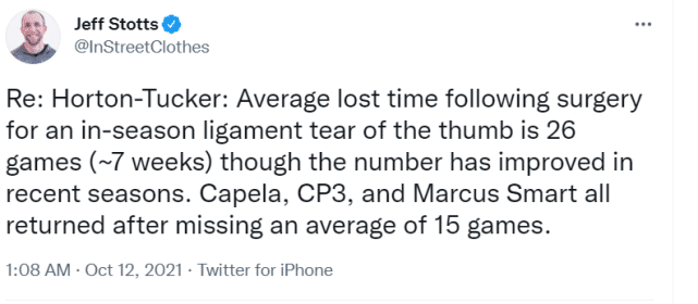 医学专家Jeff Stotts从历史角度解析了霍顿-塔克的伤病。他在社媒上写道:“赛季期间同类伤病手术的平均缺席时间是26场比赛(大约7周),不过近年来缺席时间缩短了一些。卡佩拉、保罗、马库斯-斯马特(注:都曾做过类似的手术)的平均缺席场数是15场。”
