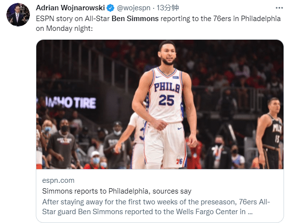 对于西蒙斯抵达费城并且即将归队,76人主教练里弗斯调侃道:“我准备给沃纳罗斯基打个电话,问问他最新情况到底怎么样了。随后老里还表示预计西蒙斯能够参加本周的训练。