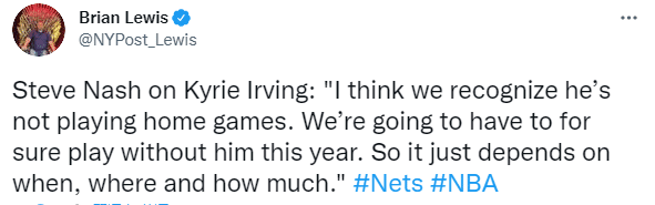 谈到欧文的情况,纳什表示他们已经意识到欧文无法参加主场的比赛,所以今年我们肯定要在没有他的情况下比赛,球队已经做好了欧文无法出战主场的准备,但不知道这种情况会持续多久以及对他们的影响有多大,纳什还表示情况随时都可能发生改变,更是直言不排除欧文新赛季打替补的可能性。