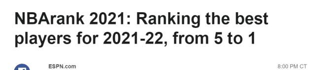 ESPN:杜兰特、字母哥、詹姆斯、东契奇、库里、约基奇、恩比德、利拉德、浓眉、哈登