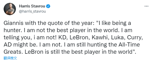 谈到谁是当今联盟最好的球员,字母哥表示:我不是目前最好的球员,我不是。杜兰特、詹姆斯、小卡、东契奇、库里和AD,你说他们其中任何一个人是我都可以接受,但我肯定不是,我仍在朝‘最好的球员之一’努力,我认为詹姆斯是目前最好的球员。