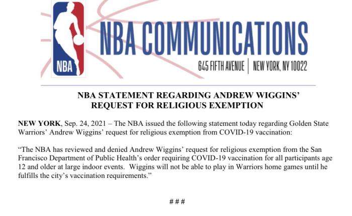 NBA拒绝维金斯申请!官方声明:若不接种疫苗,他无法参加主场比赛