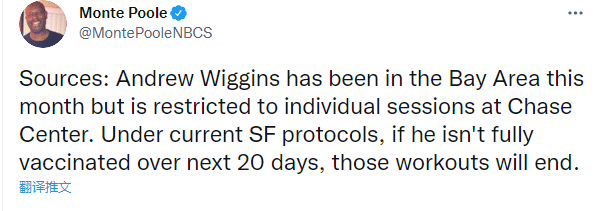 勇士记者Monte Poole报道,维金斯这个月一直在旧金山湾区(训练),但仅限于在大通中心进行个人训练。根据目前旧金山的防疫规定,如果维金斯在未来20天内没有完全接种疫苗,这些训练将会被终止。